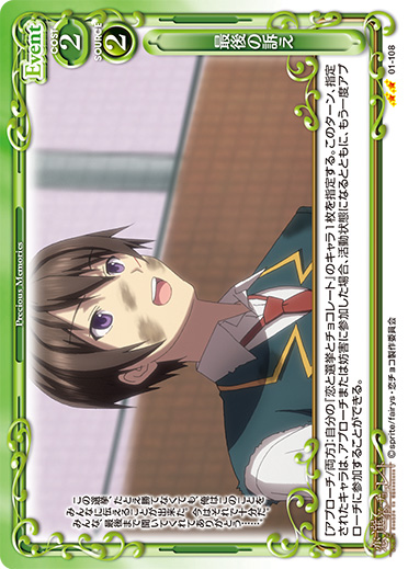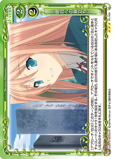 | [アプローチ/自分]:このターンの間に、アプローチでポイントを与えている自分の『恋と選挙とチョコレート』のキャラ1枚を指定する。その場合、自分の捨て札置き場にある指定したキャラと同じ名称のキャラ2枚を手札に戻す。 | ||