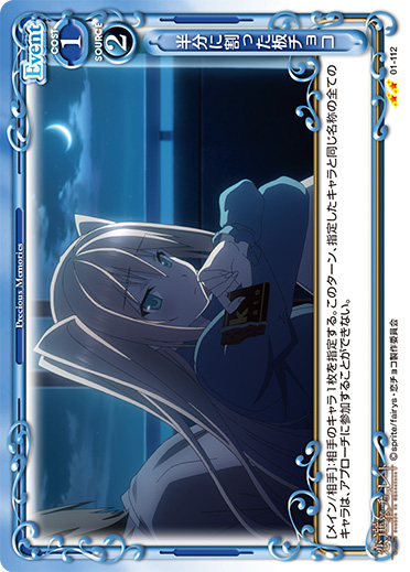 | [メイン/相手]:相手のキャラ1枚を指定する。このターン、指定したキャラと同じ名称の全てのキャラは、アプローチに参加することができない。 | ||