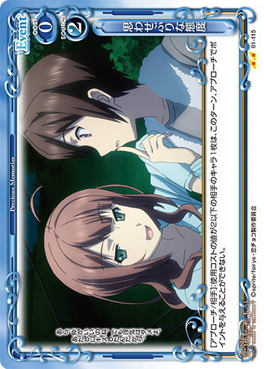 | [アプローチ/相手]:使用コストの値が2以下の相手のキャラ1枚は、このターン、アプローチでポイントを与えることができない。 | ||