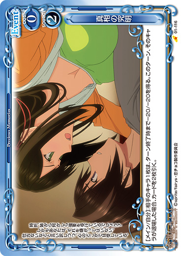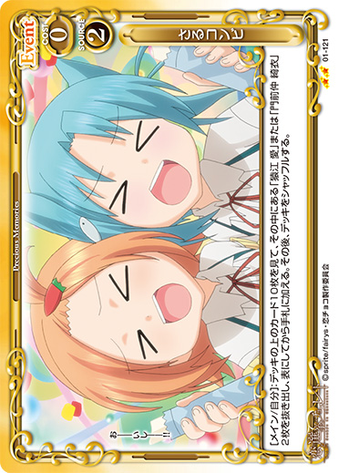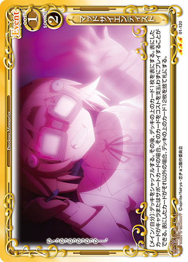 | [メイン/自分]:デッキをシャッフルする。その後、デッキの上のカード1枚を表にする。表にしたカードがキャラまたはサポートカードの場合、そのカードをコストを支払わずにプレイすることができる。表にしたカードがそれ以外の場合、デッキの上のカード12枚を捨て札にする。 | ||