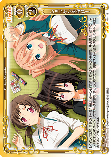 | [メイン/両方]:自分のキャラ1枚は、ターン終了時まで+20/+20を得る。その場合、相手のキャラ1枚は、このターン、アプローチに参加することができず、使用コストの値が3以上のキャラを妨害することができない。 | ||