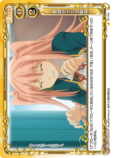 | [アプローチ/自分]:アプローチに参加している自分の「住吉 千里」1枚は、ターン終了時まで+20/+20を得る。 | ||