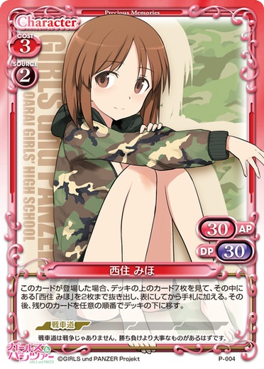| このカードが登場した場合、デッキの上のカード7枚を見て、その中にある「西住みほ」を2枚まで抜き出し、表にしてから手札に加える。その後、残りのカードを任意の順番でデッキの下に移す。 | ||