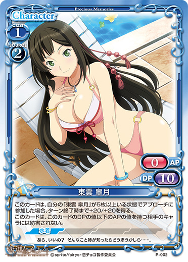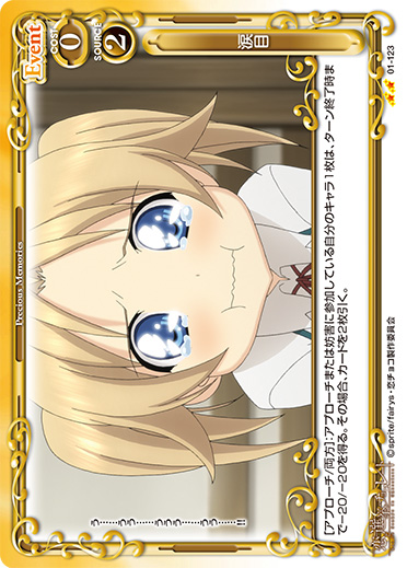 | このカードは、自分の「東雲 皐月」が5枚以上いる状態でアプローチに参加した場合、ターン終了時まで+20/+20を得る。このカードは、このカードのDPの値以下のAPの値を持つ相手のキャラには妨害されない。 | ||