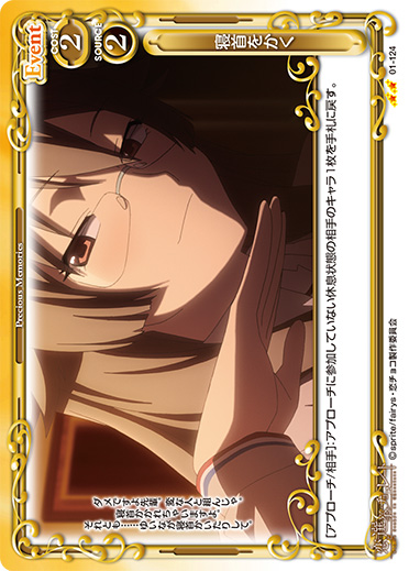 | [アプローチ/両方]:アプローチまたは妨害に参加している自分のキャラ1枚は、ターン終了時まで-20/-20を得る。その場合、カードを2枚引く。 | ||