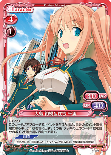 | このカードは、自分の「住吉 千里」が5枚以上いる状態でアプローチに参加した場合、ターン終了時まで+20/+20を得る。このカードは、このカードのAPの値以下のDPの値を持つ相手のキャラには妨害されない。 | ||