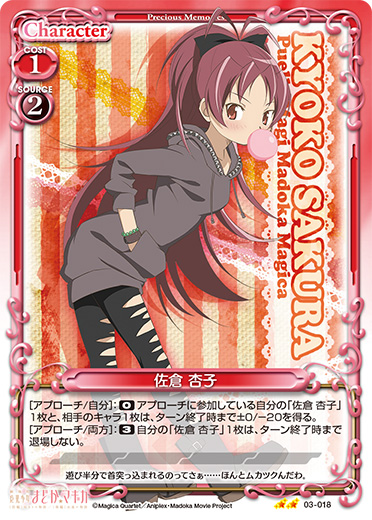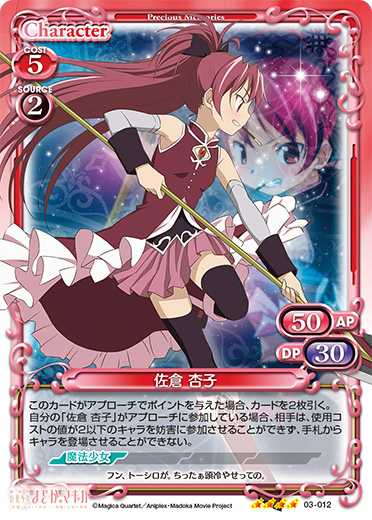 | このカードが登場した場合、このターン、自分が次にプレイする「佐倉 杏子」1枚は、使用コスト-3を得る。自分の「佐倉 杏子」のアプローチで相手のキャラが退場した場合、カードを1枚引く。 | ||