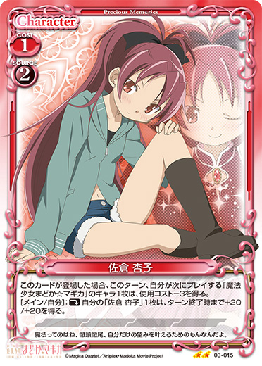 | このカードが登場した場合、このターン、自分が次にプレイする『魔法少女まどか☆マギカ』のキャラ1枚は、使用コスト-3を得る。[メイン/自分]:《休》自分の「佐倉 杏子」1枚は、ターン終了時まで+20/+20を得る。 | ||