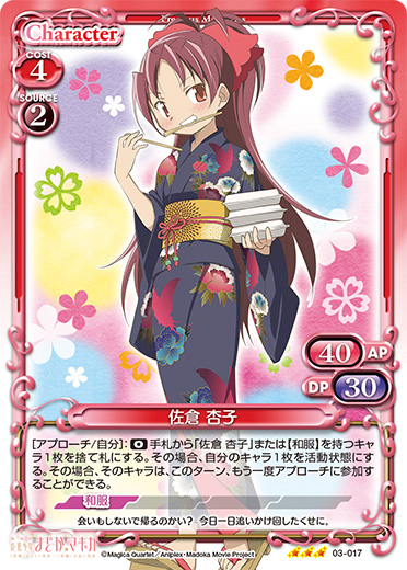 | [アプローチ/自分]:《0》手札から「佐倉 杏子」または【和服】を持つキャラ1枚を捨て札にする。その場合、自分のキャラ1枚を活動状態にする。その場合、そのキャラは、このターン、もう一度アプローチに参加することができる。 | ||