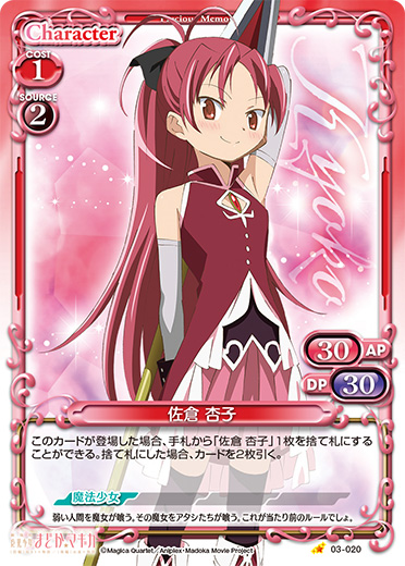 | このカードが登場した場合、手札から「佐倉 杏子」1枚を捨て札にすることができる。捨て札にした場合、カードを2枚引く。 | ||