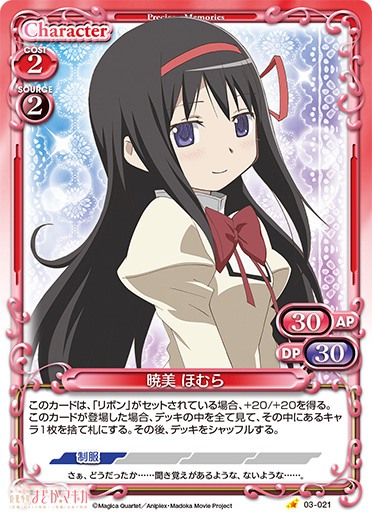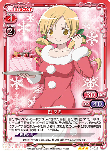 | 自分のイベントカードがプレイされた場合、自分の「巴 マミ」1枚は、ターン終了時まで+10/+10を得る。その場合、このターン、自分が次にプレイするこのカードと同じ名称、またはこのカードと同じ特徴を持つキャラ1枚は、使用コスト-2を得る。 | ||