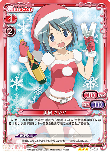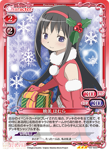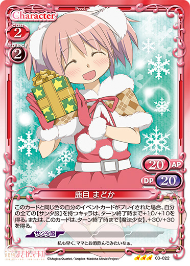| このカードと同じ色の自分のイベントカードがプレイされた場合、自分の全ての【サンタ服】を持つキャラは、ターン終了時まで+10/+10を得る。または、このカードは、ターン終了時まで【魔法少女】、+30/+30を得る。 | ||