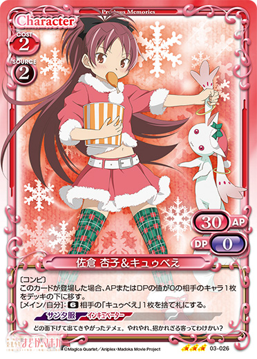 | 〔コンビ〕このカードが登場した場合、APまたはDPの値が0の相手のキャラ1枚をデッキの下に移す。[メイン/自分]:《6》相手の「キュゥべえ」1枚を捨て札にする。 | ||