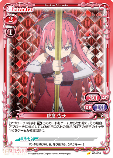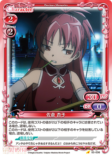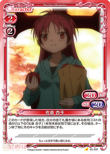 | このカードが登場した場合、自分の捨て札置き場にある使用コストの値が2以下の「佐倉 杏子」1枚を休息状態で場に出す。その場合、ターン終了時にそのキャラを活動状態にする。 | ||
