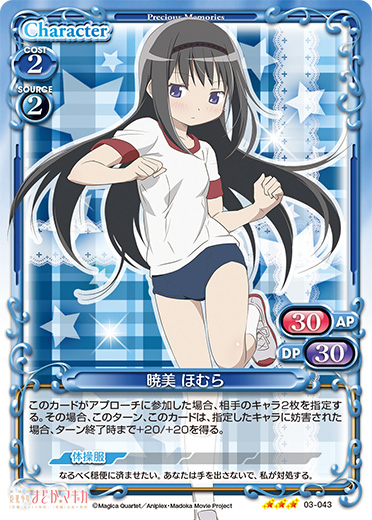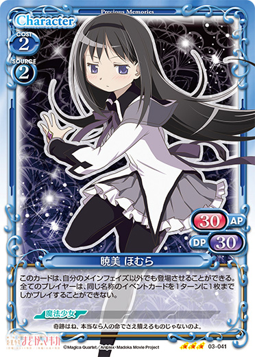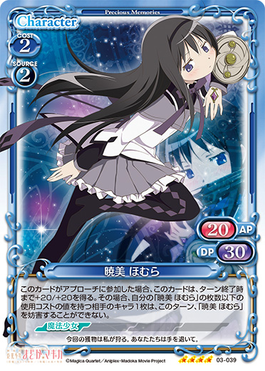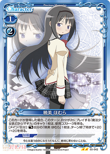 | このカードが登場した場合、このターン、自分が次にプレイする『魔法少女まどか☆マギカ』のキャラ1枚は、使用コスト-3を得る。[メイン/自分]:《休》自分の「暁美 ほむら」1枚は、ターン終了時まで+20/+20を得る。 | ||