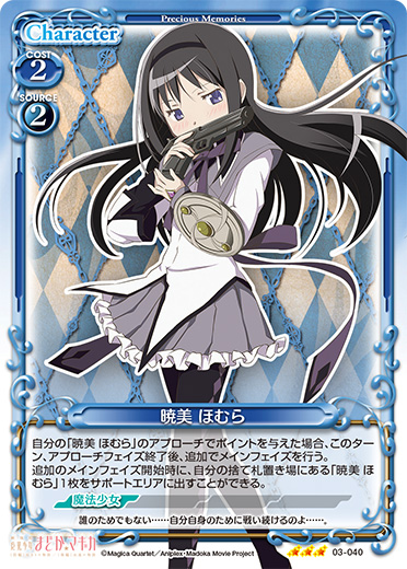 | 自分の「暁美 ほむら」のアプローチでポイントを与えた場合、このターン、アプローチフェイズ終了後、追加でメインフェイズを行う。追加のメインフェイズ開始時に、自分の捨て札置き場にある「暁美 ほむら」1枚をサポートエリアに出すことができる。 | ||