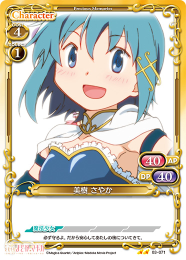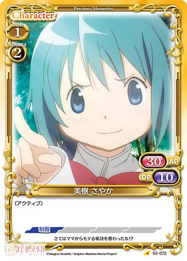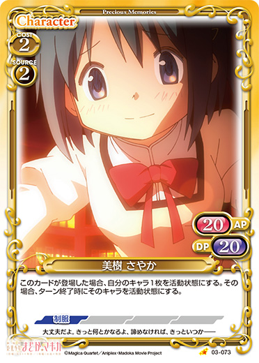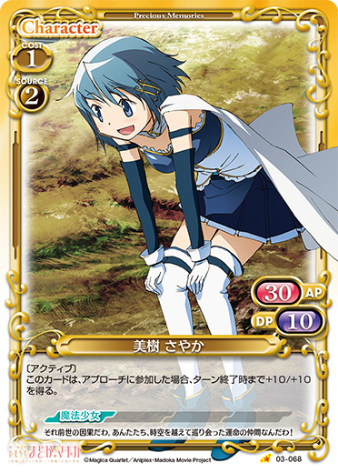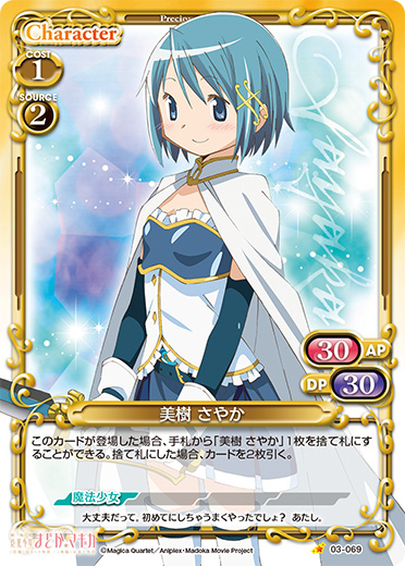 | このカードが登場した場合、手札から「美樹 さやか」1枚を捨て札にすることができる。捨て札にした場合、カードを2枚引く。 | ||