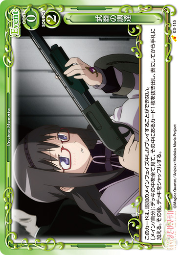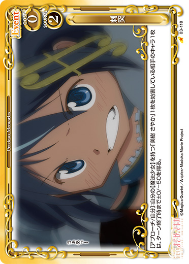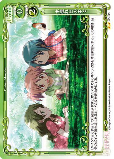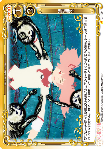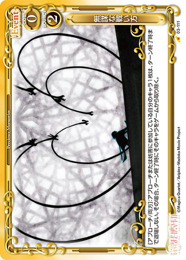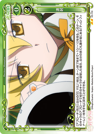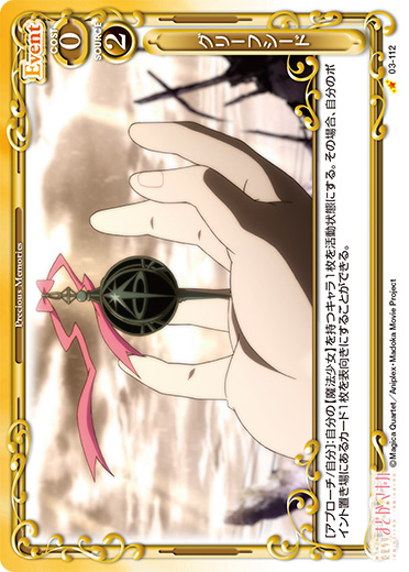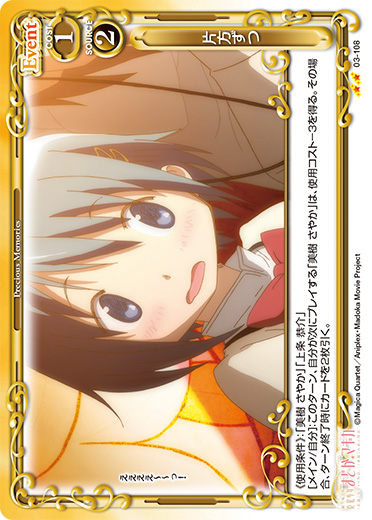 | [メイン/自分]:自分の『魔法少女まどか☆マギカ』のキャラ2枚を休息状態にする。その場合、自分のポイント置き場にあるカード2枚を表向きにする。 | ||