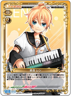 | [メイン/相手]:《休》相手のポイント置き場にあるカード1枚を裏向きにする。その場合、自分の「鏡音 レン」または「鏡音 リン」1枚は、ターン終了時まで+20/+20を得る。 | ||