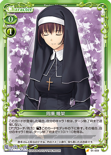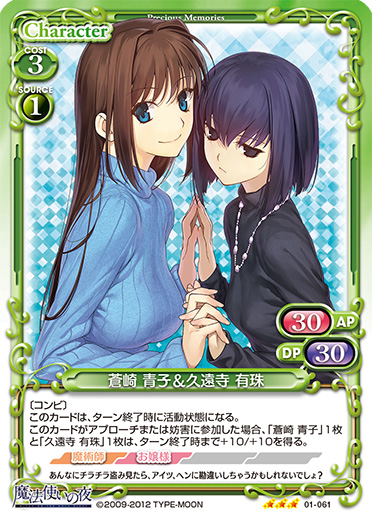 | 〔コンビ〕このカードは、ターン終了時に活動状態になる。このカードがアプローチまたは妨害に参加した場合、「蒼崎 青子」1枚と「久遠寺 有珠」1枚は、ターン終了時まで+10/+10を得る。 | ||
