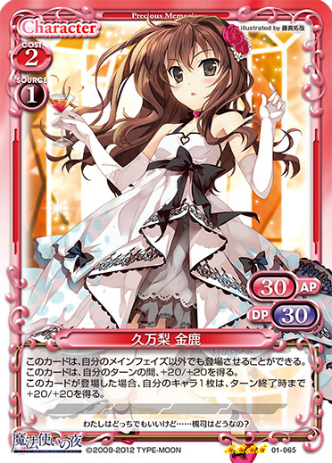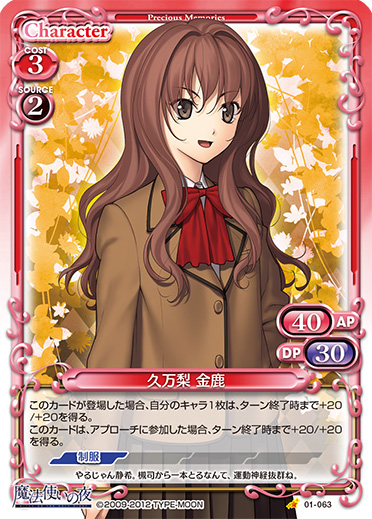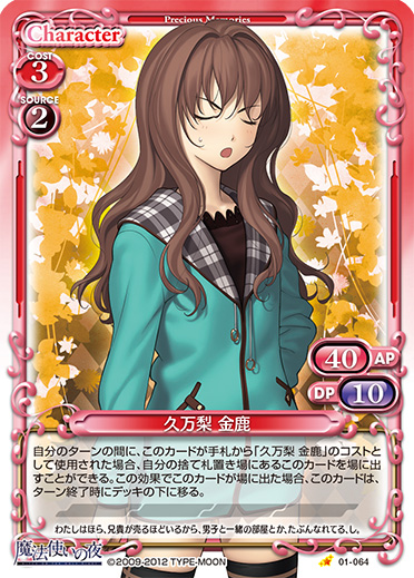 | 自分のターンの間に、このカードが手札から「久万梨 金鹿」のコストとして使用された場合、自分の捨て札置き場にあるこのカードを場に出すことができる。この効果でこのカードが場に出た場合、このカードは、ターン終了時にデッキの下に移る。 | ||