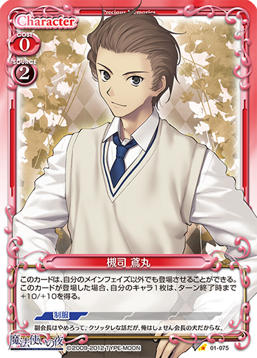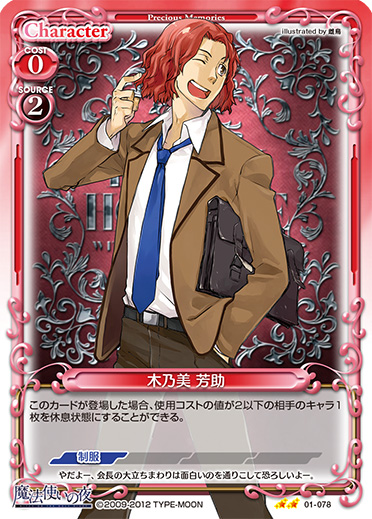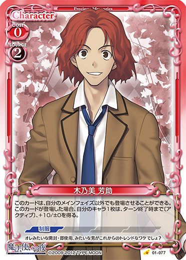 | このカードがアプローチでポイントを与えた場合、自分の捨て札置き場にある『魔法使いの夜』のキャラ1枚を手札に戻すことができる。このカードがアプローチに参加した場合、キャラ2枚を指定する。このターン、そのキャラは、このカードを妨害することができない。 | ||