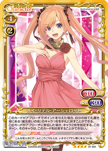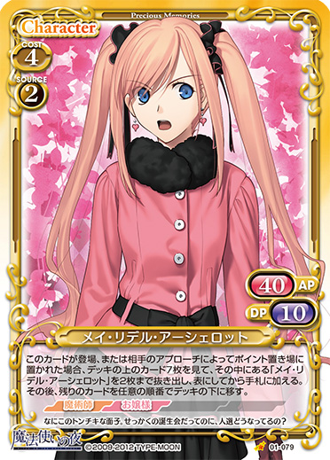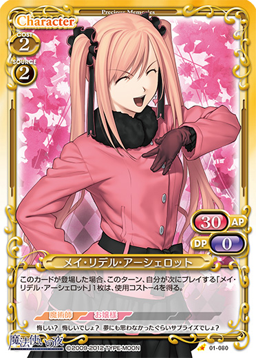 | このカードが登場した場合、このターン、自分が次にプレイする「メイ・リデル・アーシェロット」1枚は、使用コスト-4を得る。 | ||