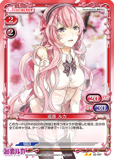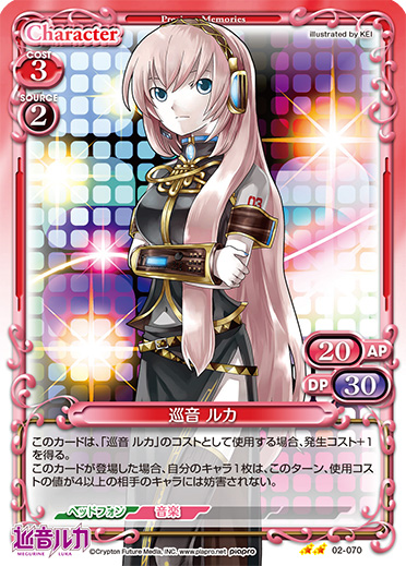 | このカードは、「巡音 ルカ」のコストとして使用する場合、発生コスト+1を得る。このカードが登場した場合、自分のキャラ1枚は、このターン、使用コストの値が4以上の相手のキャラには妨害されない。 | ||