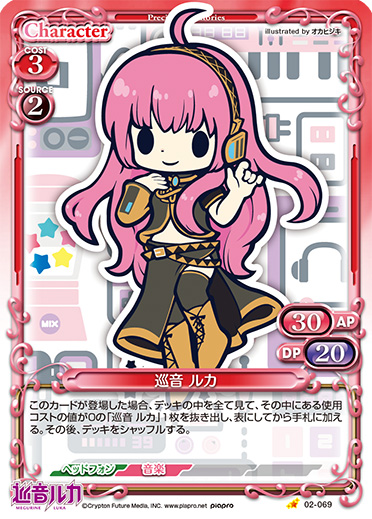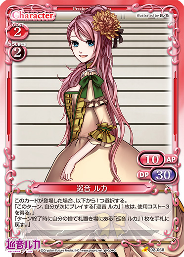 | このカードが登場した場合、デッキの中を全て見て、その中にある使用コストの値が0の「巡音 ルカ」1枚を抜き出し、表にしてから手札に加える。その後、デッキをシャッフルする。 | ||