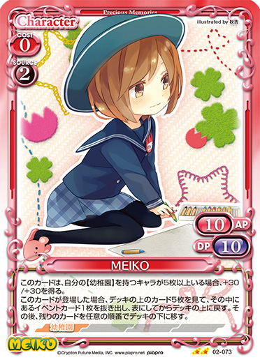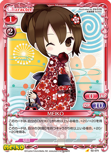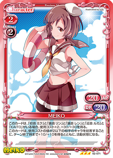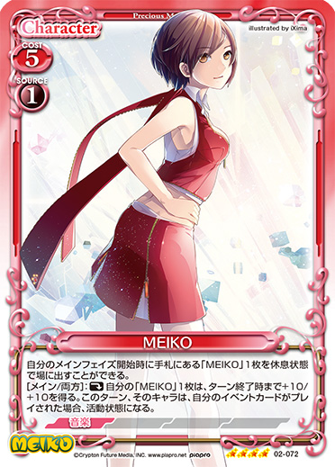 | 自分のメインフェイズ開始時に手札にある「MEIKO」1枚を休息状態で場に出すことができる。[メイン/両方]:《休》自分の「MEIKO」1枚は、ターン終了時まで+10/+10を得る。このターン、そのキャラは、自分のイベントカードがプレイされた場合、活動状態になる。 | ||