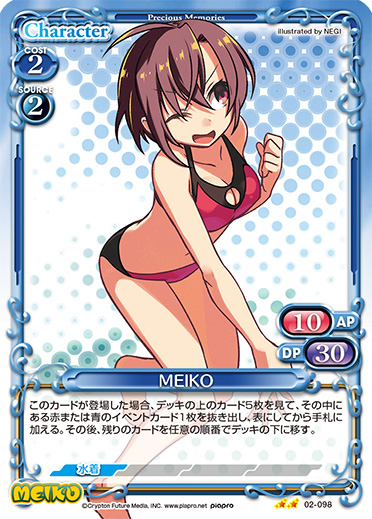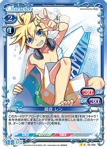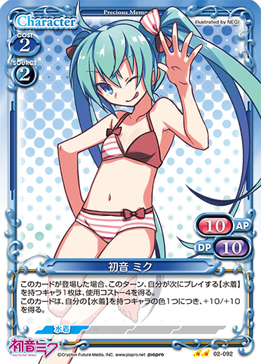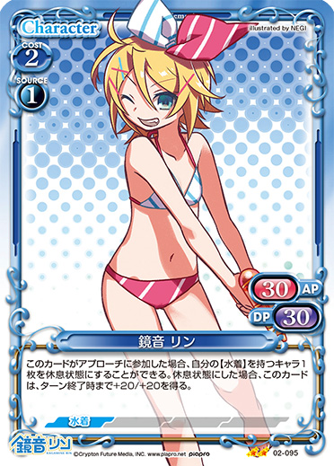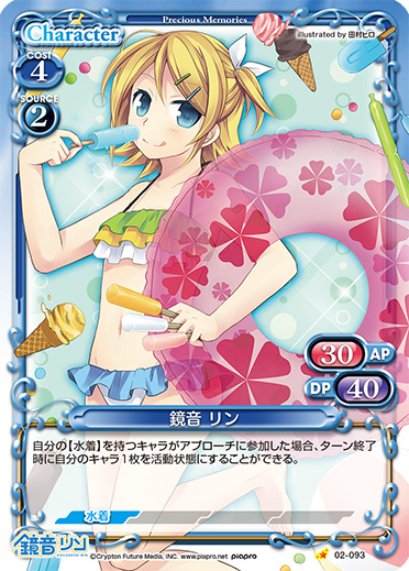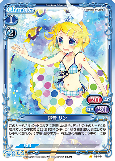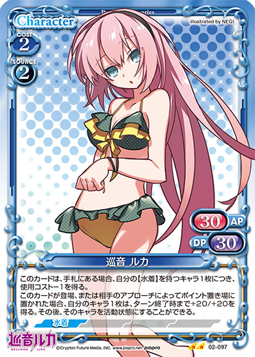 | このカードは、手札にある場合、自分の【水着】を持つキャラ1枚につき、使用コスト-1を得る。このカードが登場、または相手のアプローチによってポイント置き場に置かれた場合、自分のキャラ1枚は、ターン終了時まで+20/+20を得る。その後、そのキャラを活動状態にすることができる。 | ||