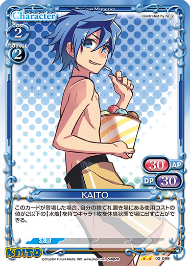 | このカードが登場した場合、自分の捨て札置き場にある使用コストの値が2以下の【水着】を持つキャラ1枚を休息状態で場に出すことができる。 | ||