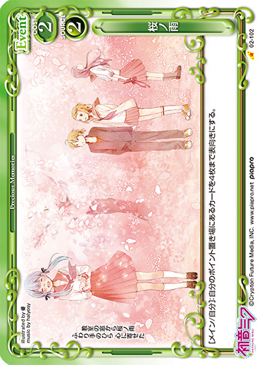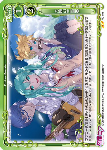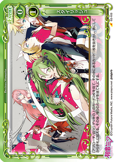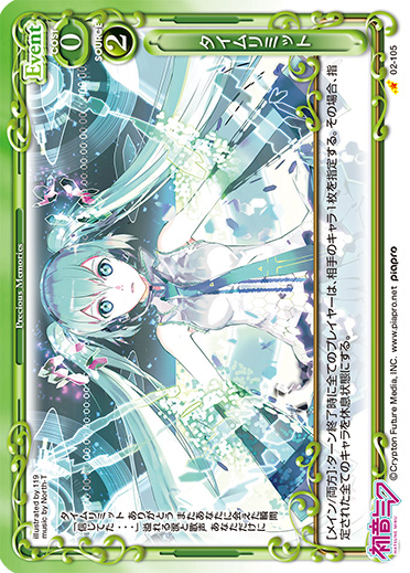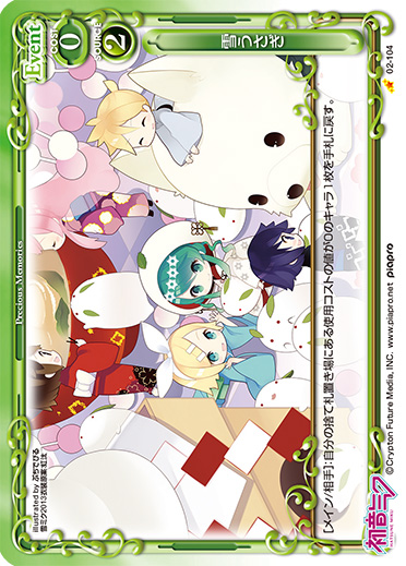 | [アプローチ/自分]:デッキの上のカード4枚を見て、その中にある『初音 ミク』のキャラを2枚まで抜き出し、表にしてから手札に加える。その後、残りのカードを任意の順番でデッキの下に移す。 | ||