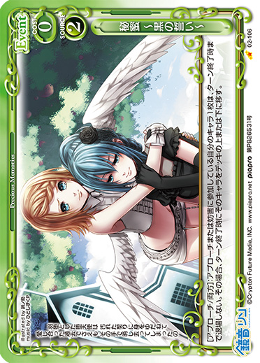 | [アプローチ/両方]:アプローチまたは妨害に参加している自分のキャラ1枚は、ターン終了時まで退場しない。その場合、ターン終了時にそのキャラをデッキの上または下に移す。 | ||