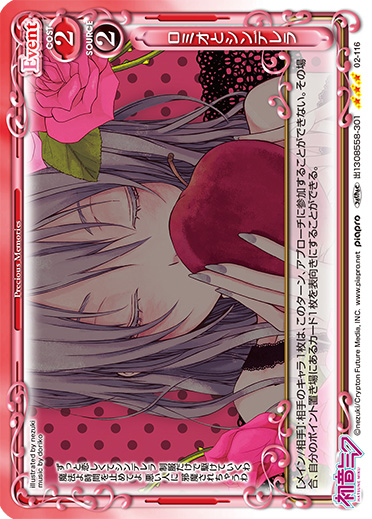 | [メイン/相手]:相手のキャラ1枚は、このターン、アプローチに参加することができない。その場合、自分のポイント置き場にあるカード1枚を表向きにすることができる。 | ||