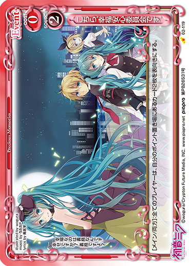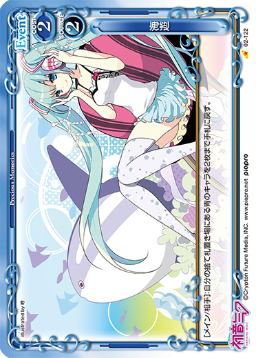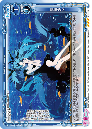 | [メイン/割り込み]:相手のプレイ中の使用コストの値が1以下のキャラ1枚を無効にする。その場合、無効にしたキャラをデッキの下に移す。 | ||