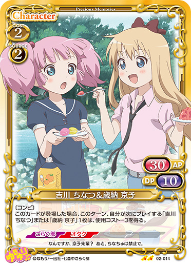 | 〔コンビ〕このカードが登場した場合、このターン、自分が次にプレイする「吉川 ちなつ」または「歳納 京子」1枚は、使用コスト-3を得る。 | ||