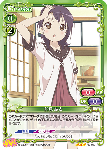 | このカードがアプローチに参加した場合、このカードをデッキの下に移すことができる。デッキの下に移した場合、手札から「船見 結衣」1枚を場に出す。 | ||
