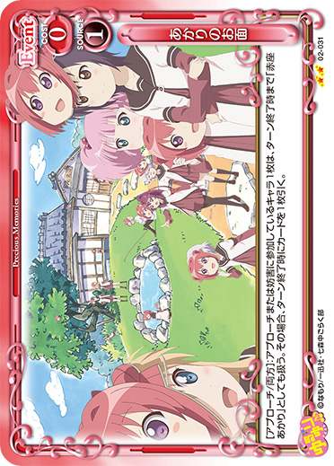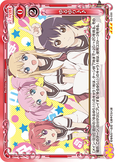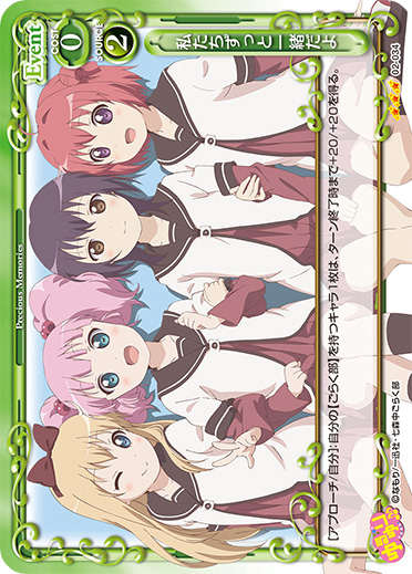 | [メイン/自分]:自分の『ゆるゆり♪♪』のキャラ1枚は、ターン終了時まで+20/+20を得る。その場合、このターン、自分が次にプレイする『ゆるゆり♪♪』のキャラ1枚は、使用コスト-3を得る。 | ||