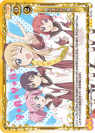 | [メイン/両方]:手札から『ゆるゆり♪♪』のキャラ1枚を捨て札にする。その場合、手札から捨て札にしたキャラと同じ名称のキャラ1枚を場に出す。 | ||