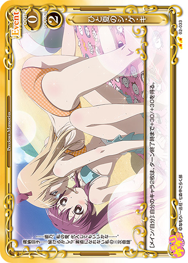 | [アプローチ/自分]:自分の【ごらく部】を持つキャラ1枚は、ターン終了時まで+20/+20を得る。 | ||