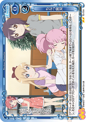 | [アプローチ/自分]:自分の「吉川 ちなつ」1枚は、ターン終了時まで+20/+20を得る。このターン、そのキャラがアプローチでポイントを与えた場合、カードを2枚引く。 | ||