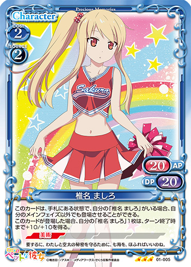 | このカードは、自分の「椎名 ましろ」が登場した場合、ターン終了時まで+20/+20を得る。その場合、このターン、このカードがアプローチでポイントを与えた場合、カードを1枚引く。 | ||