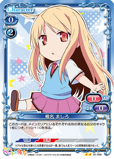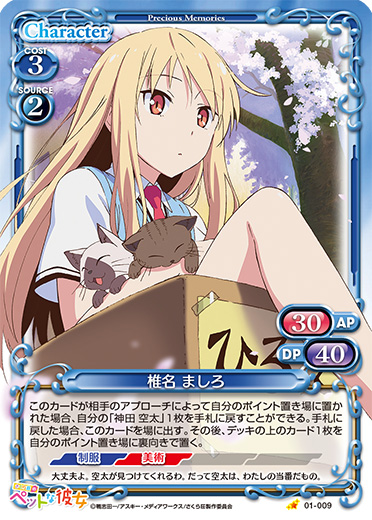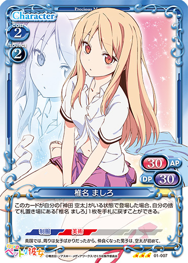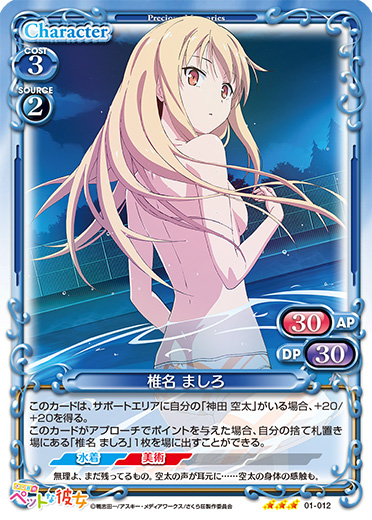 | このカードは、サポートエリアに自分の「神田 空太」がいる場合、+20/+20を得る。このカードがアプローチでポイントを与えた場合、自分の捨て札置き場にある「椎名 ましろ」1枚を場に出すことができる。 | ||