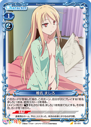 | このカードが登場した場合、このターン、自分が次にプレイする「椎名 ましろ」1枚は、使用コスト-3を得る。[メイン/両方]:《休》手札から「椎名 ましろ」1枚を捨て札にする。その場合、カードを1枚引く。 | ||
