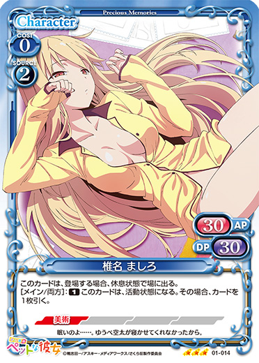| このカードが登場した場合、このターン、自分が次にプレイする『さくら荘のペットな彼女』のキャラ1枚は、使用コスト-3を得る。このカードが退場した場合、相手のキャラ1枚は、このターン、アプローチに参加することができない。 | ||