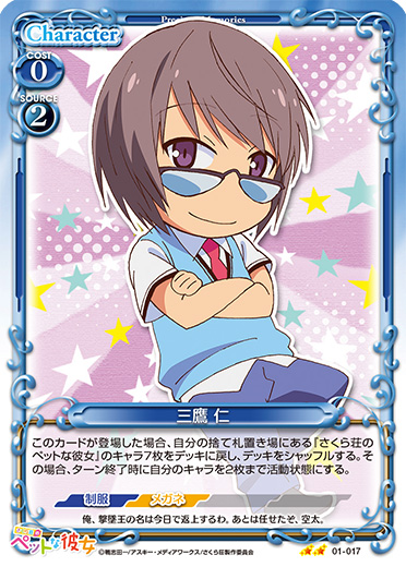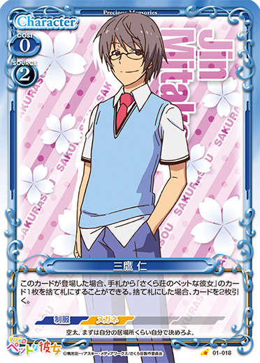 | このカードが登場した場合、手札から『さくら荘のペットな彼女』のカード1枚を捨て札にすることができる。捨て札にした場合、カードを2枚引く。 | ||
