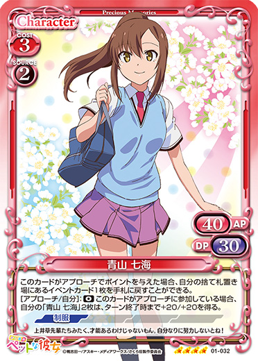 | このカードがアプローチでポイントを与えた場合、自分の捨て札置き場にあるイベントカード1枚を手札に戻すことができる。[アプローチ/自分]:《0》このカードがアプローチに参加している場合、自分の「青山 七海」2枚は、ターン終了時まで+20/+20を得る。 | ||