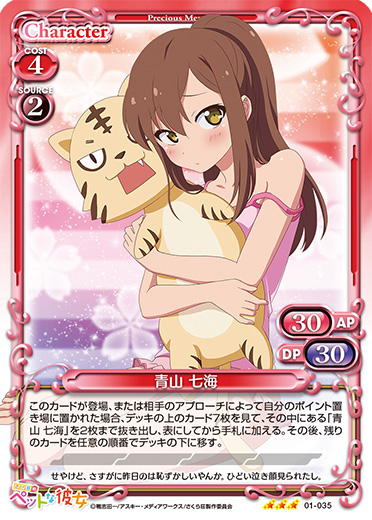 | このカードは、「青山 七海」のコストとして使用する場合、発生コスト+1を得る。このカードは、自分の「青山 七海」が4枚以上いる場合、+20/+20を得る。 | ||