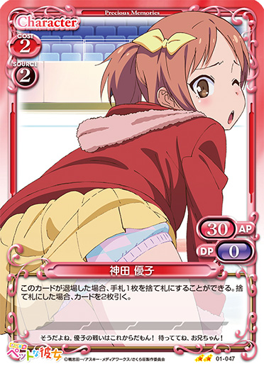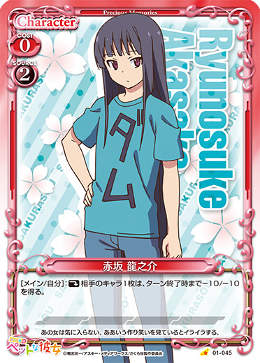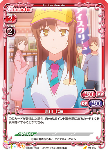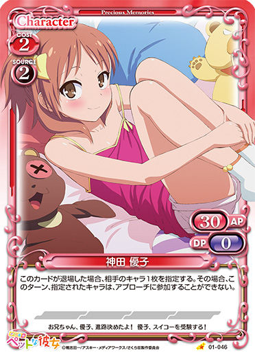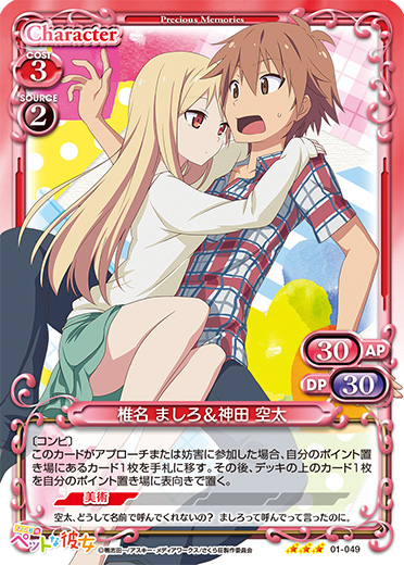 | このカードが登場した場合、このターン、自分が次にプレイする『さくら荘のペットな彼女』のキャラ1枚は、使用コスト-3を得る。このカードがアプローチに参加した場合、このカード以外の自分のキャラ1枚は、ターン終了時まで+20/+20を得る。 | ||